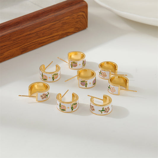 Vintage Floral Enamel Drop Earrings - Gold Plated Copper with Colorful Hand-Painted Details