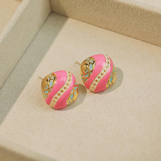 Vintage-inspired Pink Geometric Square Stud Earrings in Gold Plating