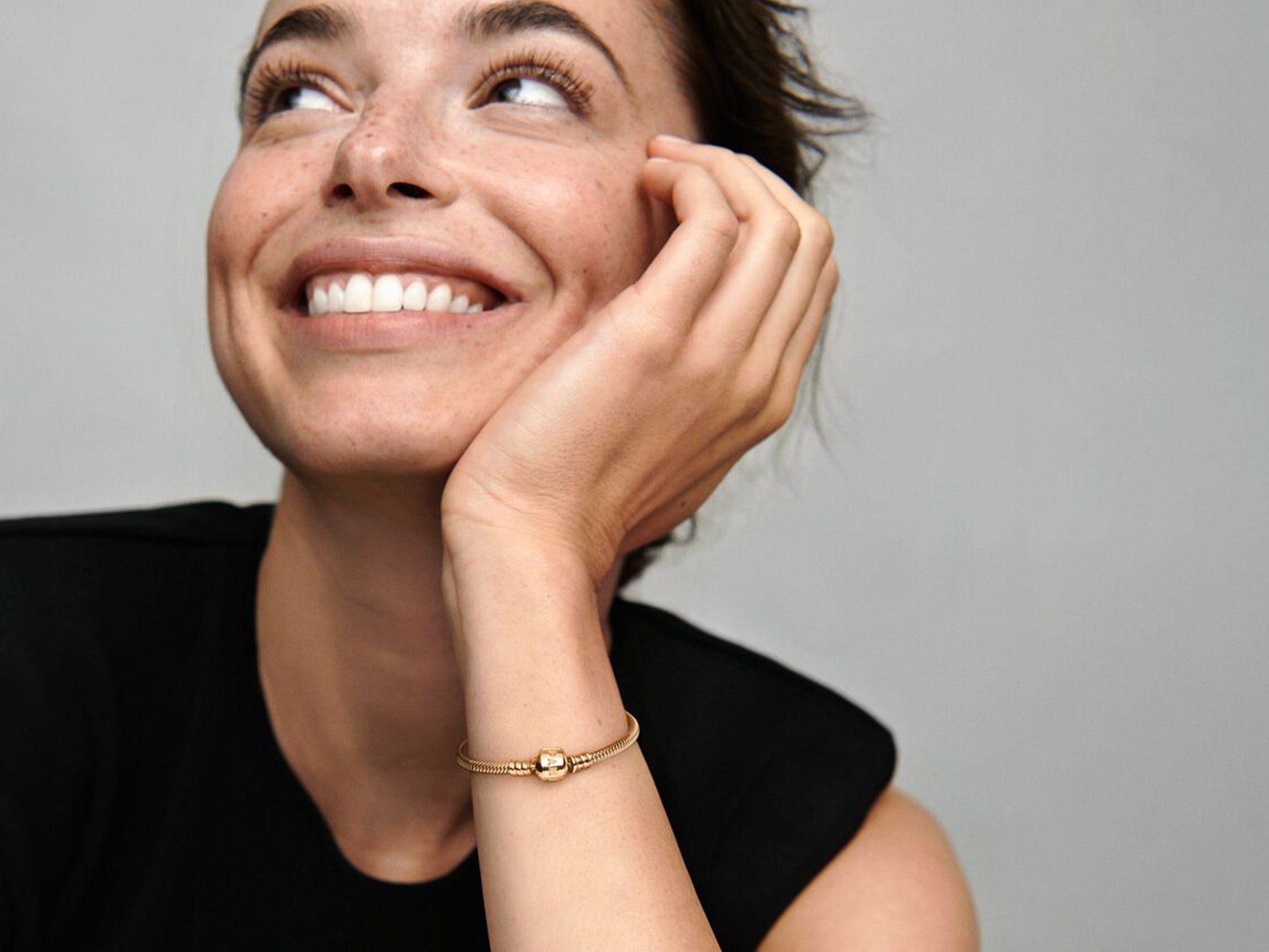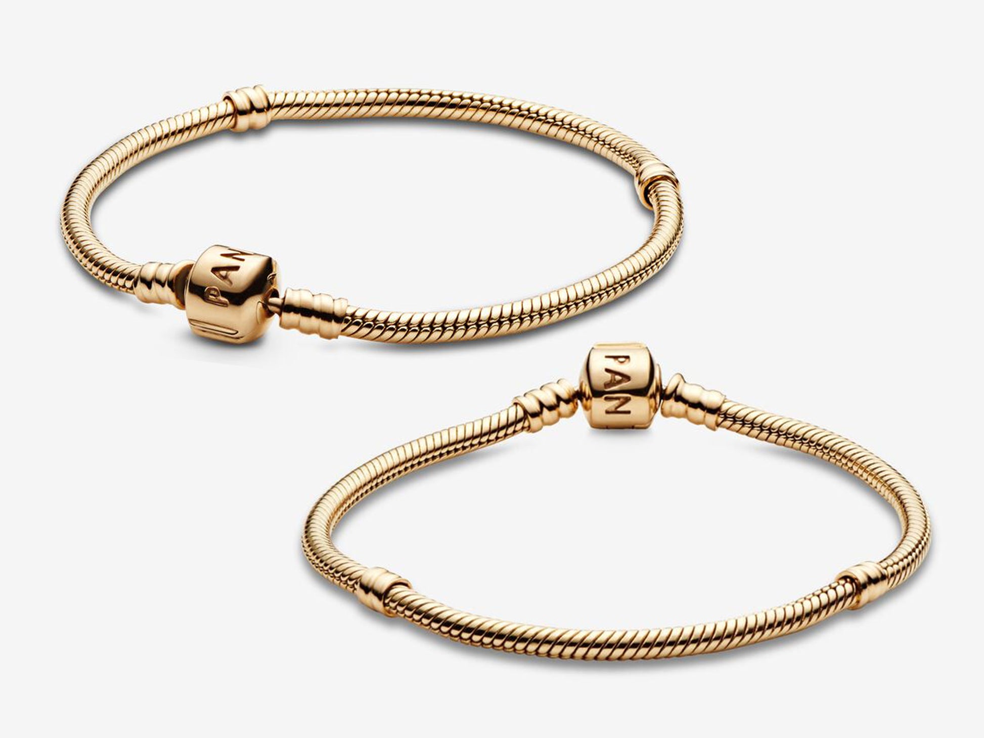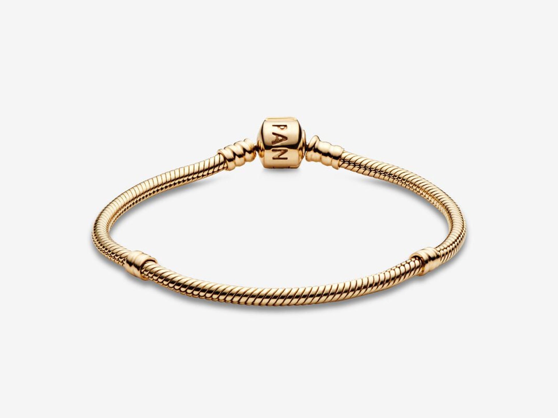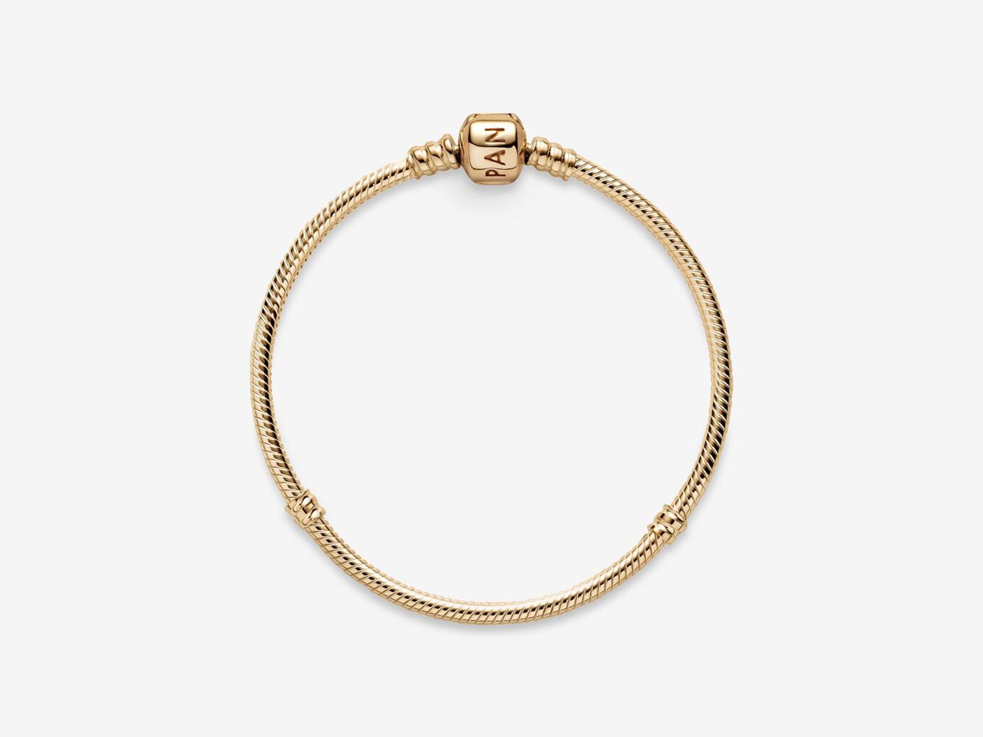 This charm bracelet is the perfect foundation for your Pandora collection. Hand-finished in 14k gold, this snake chain bracelet features Pandora's iconic barrel clasp for a secure fit while the innovative threading system makes it easy to screw charms onto your bracelet. Simply add a couple of clips to divide the bracelet into three sections, then choose your favourite Pandora charms to express your unique style.