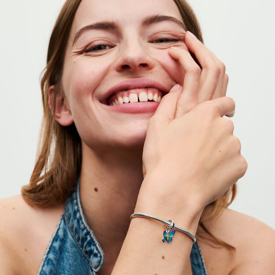 New year, new mantra. The Pandora Club 2024 Butterfly Dangle Charm is inspired by a symbol of beauty, strength and transformation: the butterfly. This sterling silver butterfly charm features movable wings with transparent two-tone blue enamel revealing intricate patterns beneath. The backs of the wings are engraved with the message "Believe you can." At the centre of the butterfly is a 14k gold-plated heart set with a sparkling lab-grown diamond, and the bail in engraved with the year 2024. Add it to your Pandora Club Charm collection as a symbol of good things to come and the power of believing in your own potential.
