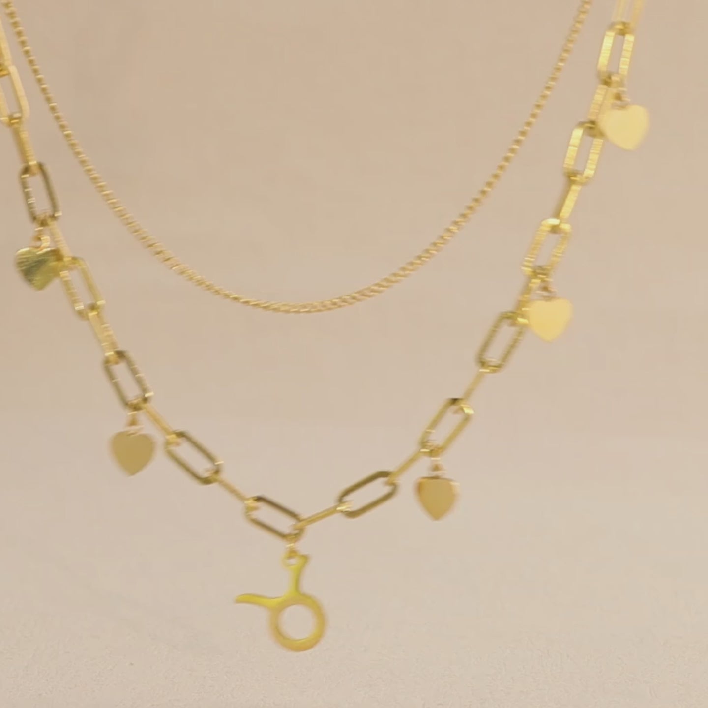 "Elevate your style with our multi-layered Gold Cross Necklace featuring constellation-themed pendants like Taurus and heart shapes. A blend of modern design and celestial elegance, expressing your unique personality."