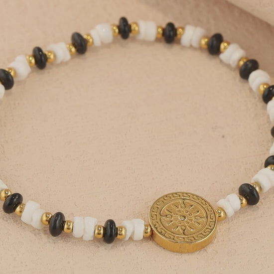 This unique bracelet features a blend of stainless steel, shell, and natural stone beads, creating a striking piece that blends ethnic and retro styles. The bracelet is composed of a chain with a variety of beads and charms, including shell and stone accents in black and white colors, adding a bold and contrasting look. With a length of 18cm and a weight of 5.8g, this bracelet is suitable for adult women looking to express their personal style. The smooth surface finish enhances the elegance of the piece, making it perfect for casual or special occasions. The bracelet is secured with a spring ring closure for easy wear.