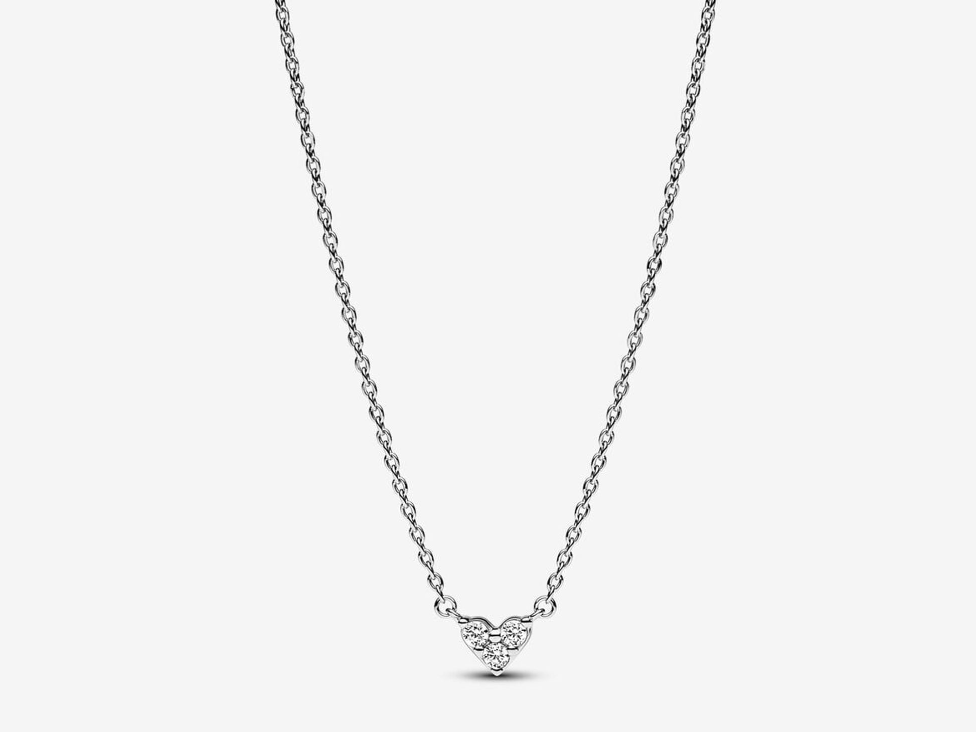 Wear a symbol of love in the Triple Stone Heart Collier Necklace. The delicate, sparkling stones of this sterling silver necklace take their inspiration from everlasting love. The new Pandora Timeless design arranges three round brilliant-cut stones into a refined heart-shaped style. Whether you want to wear it alone for subtle sparkle or layer it with other styles, this heart necklace is sure to light up any room.