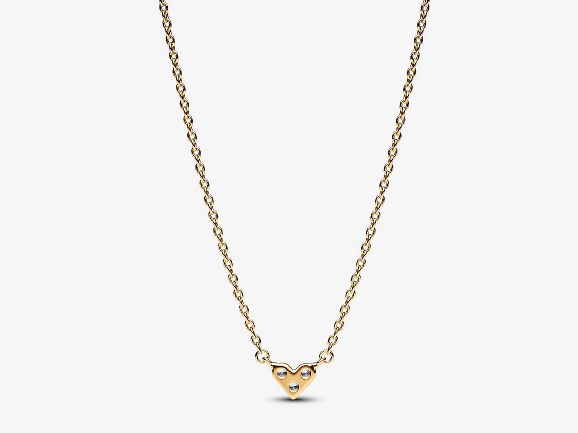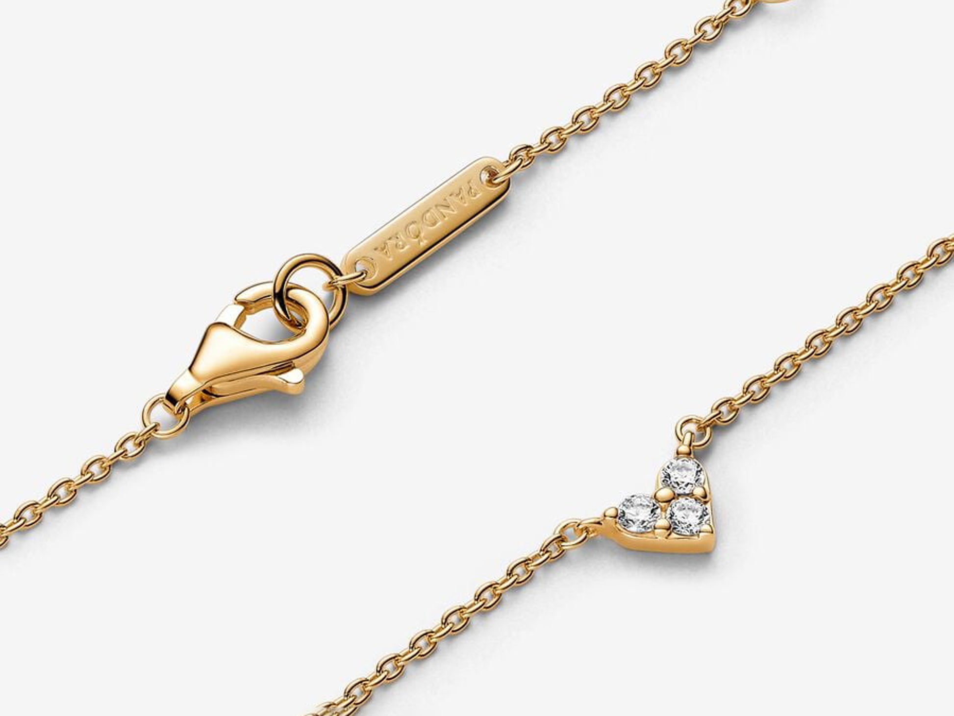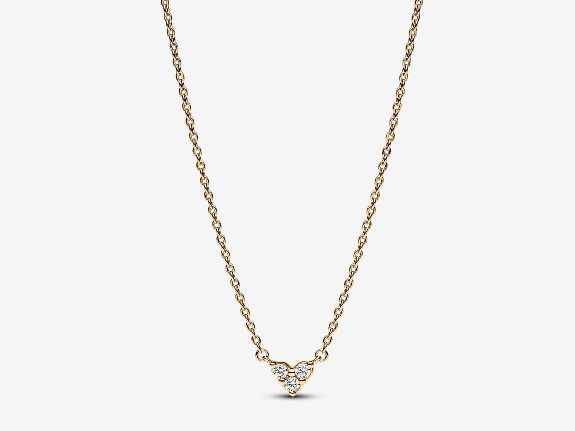 Wear a symbol of love in the Triple Stone Heart Collier Necklace. The delicate, sparkling stones of this 14k gold-plated necklace take their inspiration from everlasting love. The new Pandora Timeless design arranges three round brilliant-cut stones into an elegant and refined heart-shaped style. Whether you want to wear it alone for subtle sparkle or layer it with other styles, this heart necklace will light up any room.
