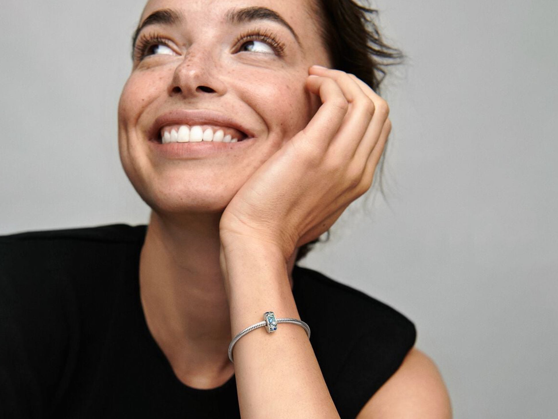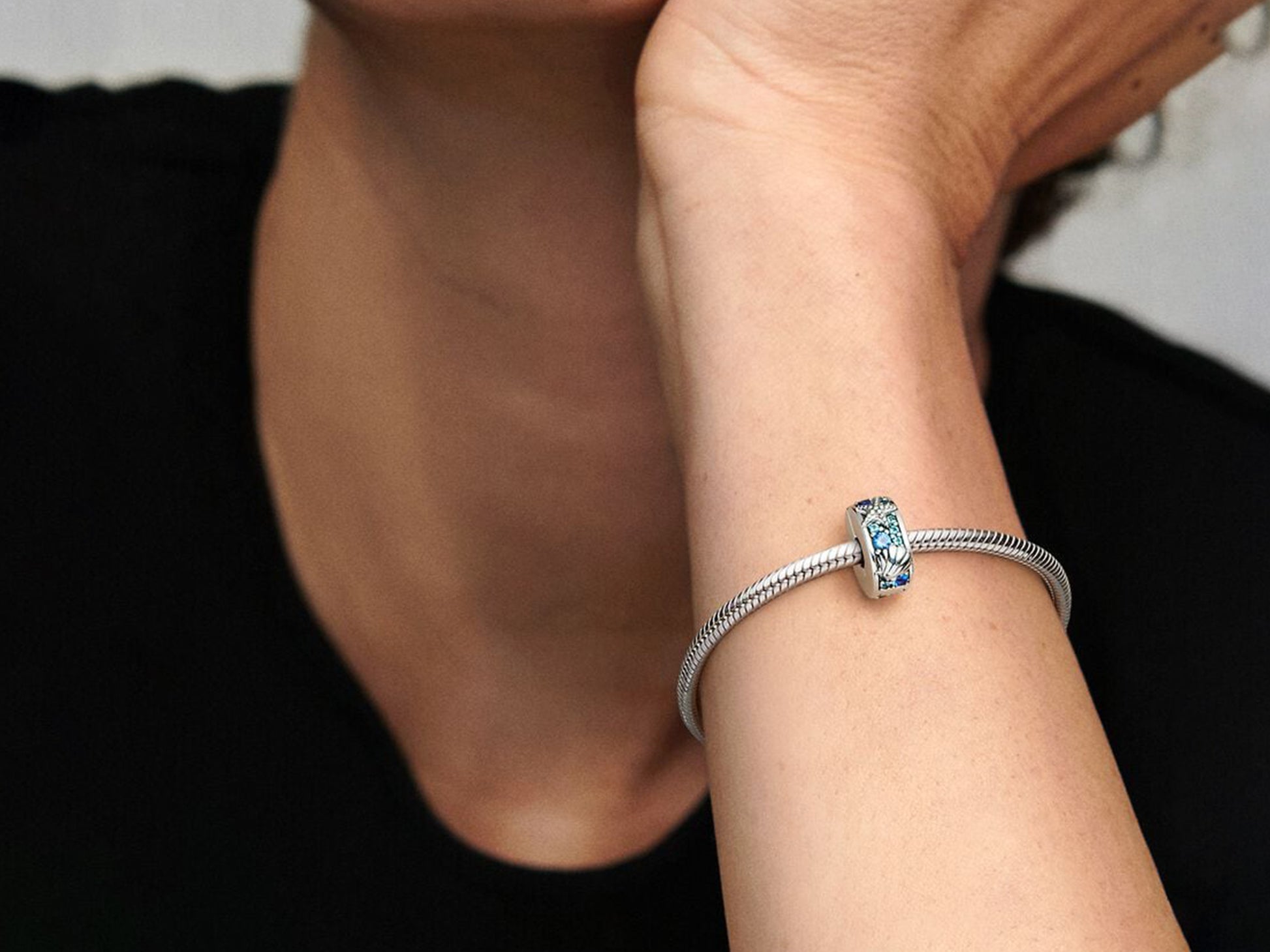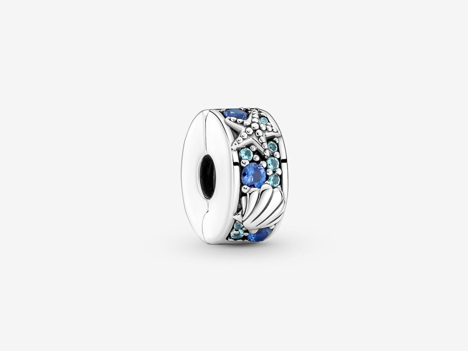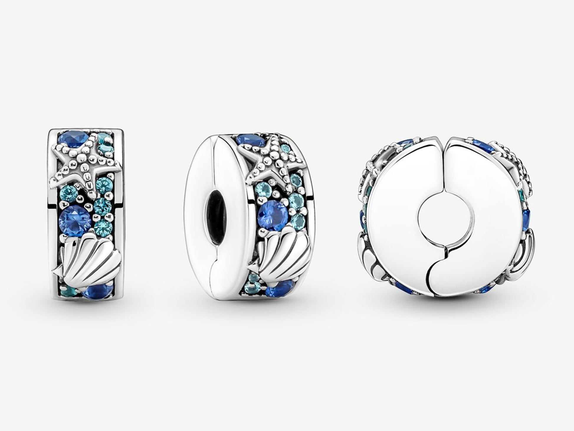Imagine sunny days in the surf and sand with the Tropical Starfish & Shell Clip Charm. Inspired by treasures found on the beach, it features shells and starfish surrounded by pavé detailing in blue and turquoise man-made crystals to represent the sparkling ocean waves. This clip charm has a silicone grip to hold it in place, meaning it does not fit onto the two threads (raised charm dividers). It can be styled anywhere else on your bracelet for a carefree, beachy vibe.
