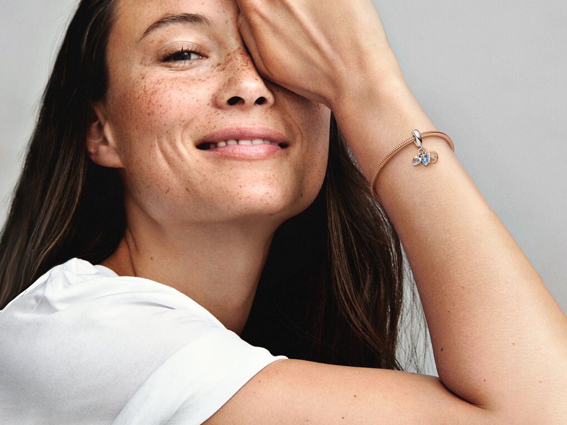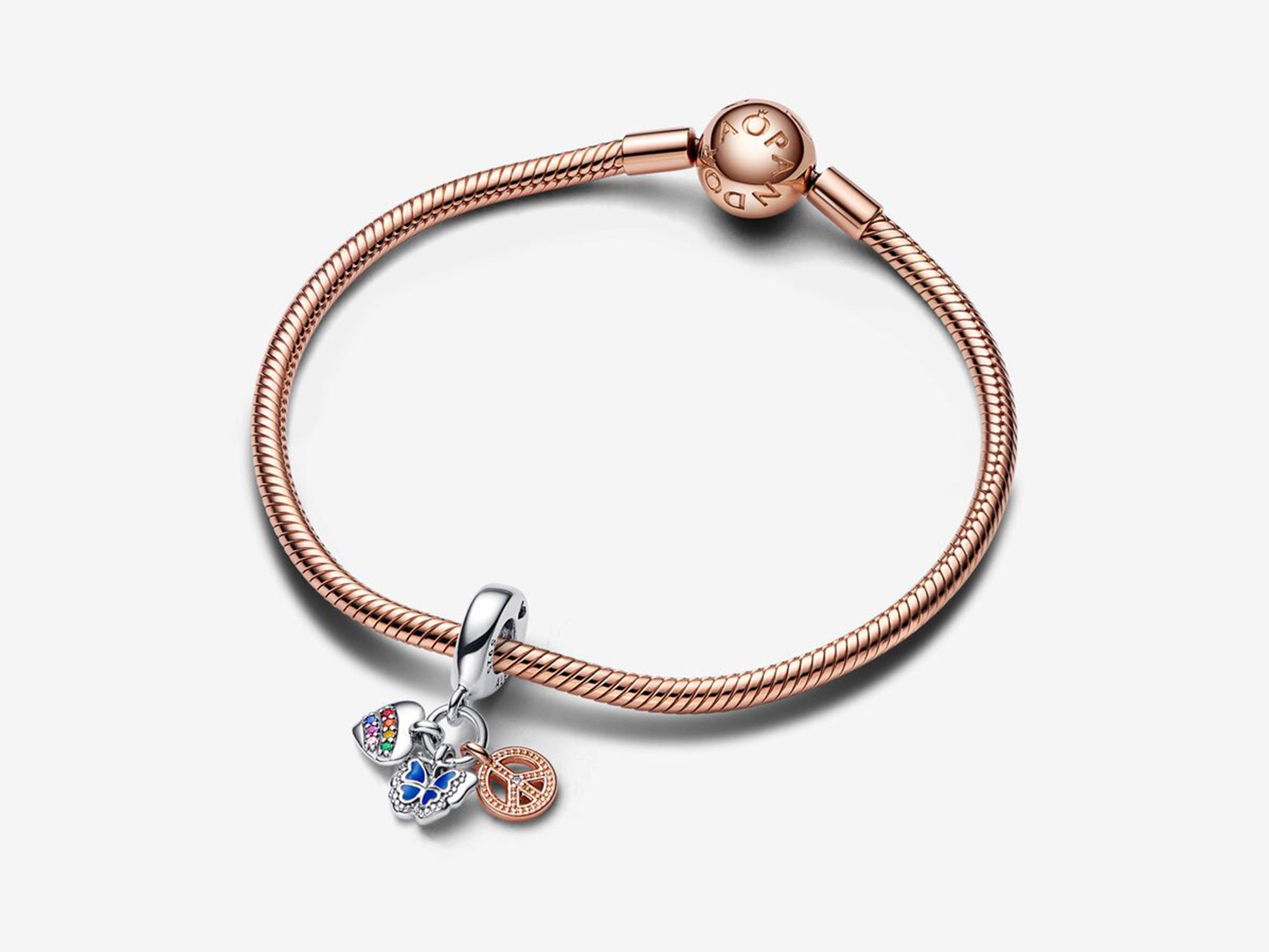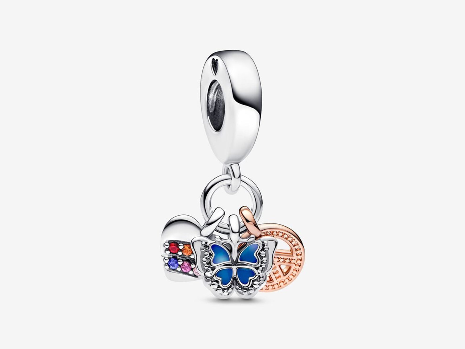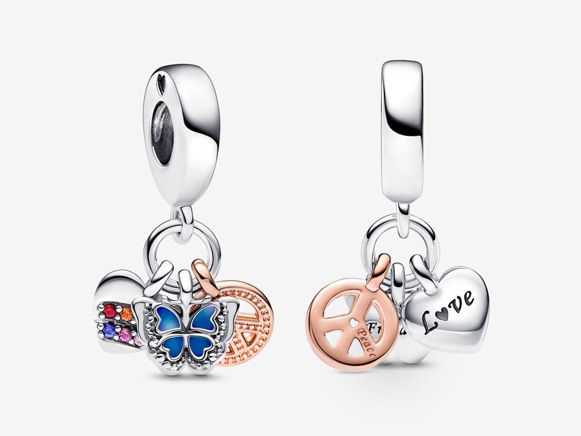 Bring extra meaning to your styling with our Two-tone Rainbow Heart, Butterfly & Peace Triple Dangle Charm. This triple dangle charm features a sterling silver heart set with two rows of rainbow pavé and engraved with "Love" on the back; a sterling silver butterfly shaded with hand-applied blue enamel and engraved with "Freedom" on the back; and a 14k rose gold-plated peace sign detailed with microbeads and a stone at its centre and engraved with "Peace" on the back. Wear it as an everyday reminder of your values.