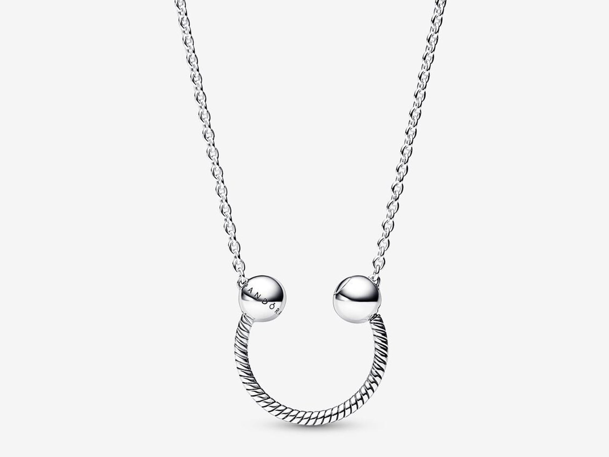 Give luck a chance with the Pandora Moments U-Shape Charm Pendant Necklace. Reminiscent of the traditional symbol of good fortune - the horseshoe, this pendant in our iconic snake chain pattern can be styled with 2-3 of your favorite Pandora charms. This necklace features two ball clasps connected to the pendant at the top, one of which is openable and it is also adjustable to two lengths. Bring positive energy to your look with this easy-to-personalise charm holder or gift it to the charm collector in your life.