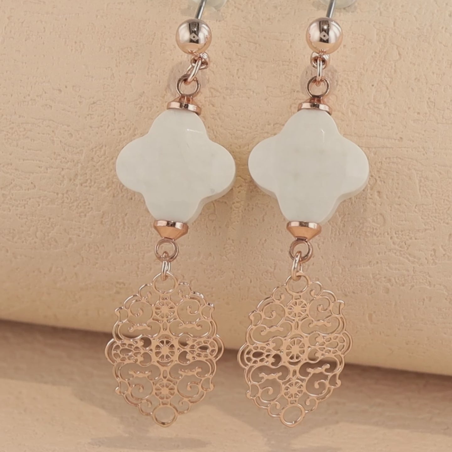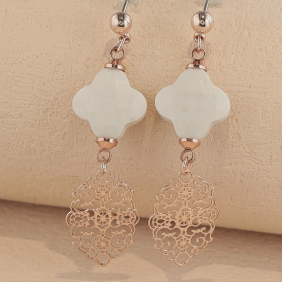 These earrings are made of copper and natural stone, featuring an ornament structure with pendant and tassel, measuring 4.9*1.3cm and weighing 2.3g. The earrings are in white color with a smooth surface, showcasing a specific pattern of clover shapes. They are designed for adult women who appreciate fashion and want to express their personality with a focus on hope and courage. Crafted using casting, polishing, and polishing techniques, these earrings highlight their unique shape and structure. With a vintage and retro appeal, these earrings are perfect for making a fashion statement and reflecting your vision for the future.