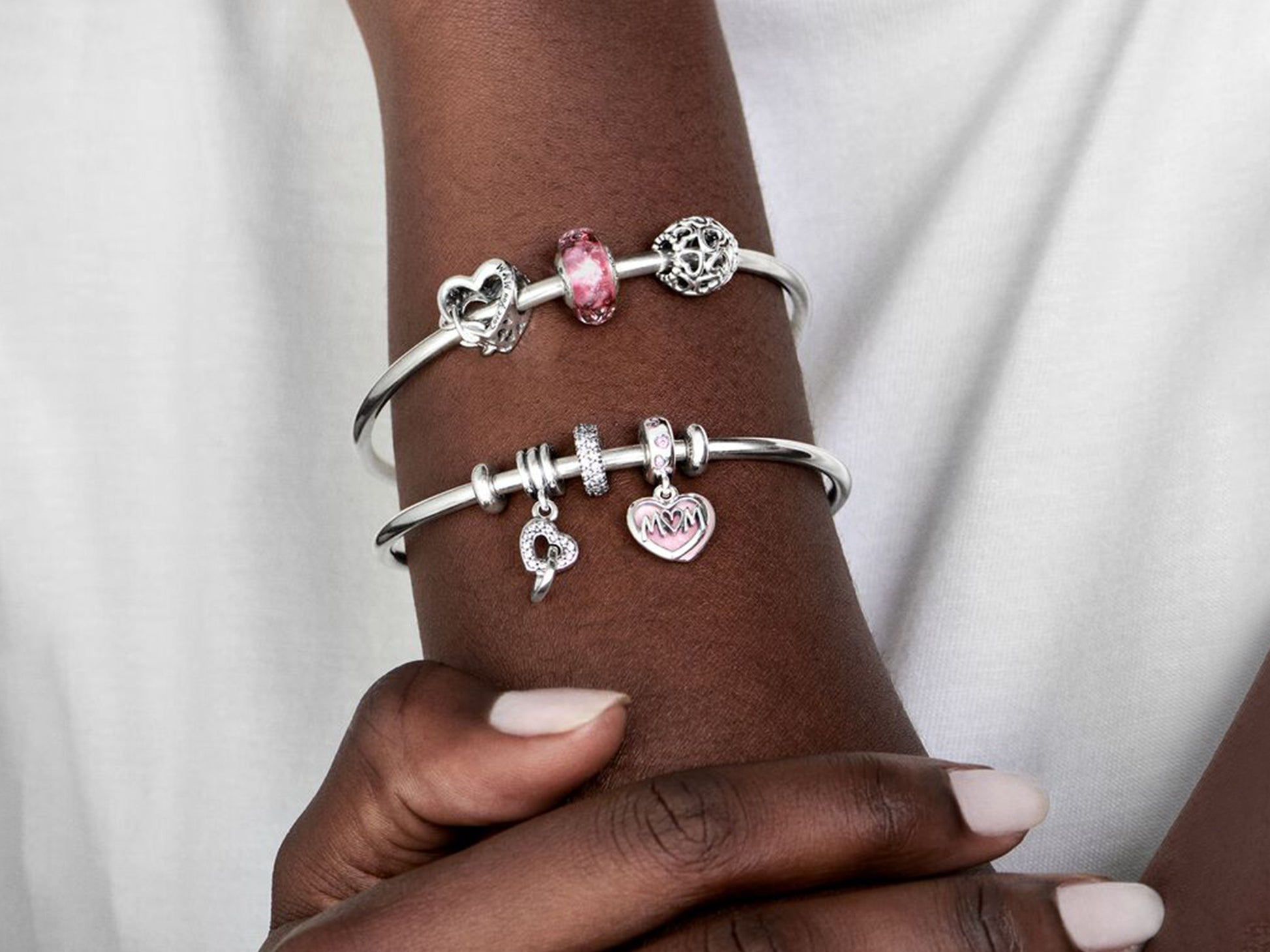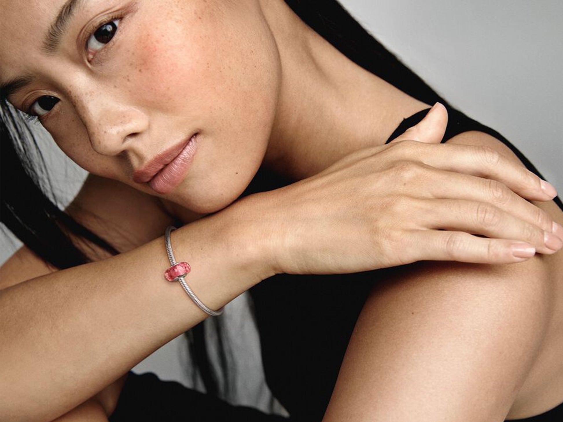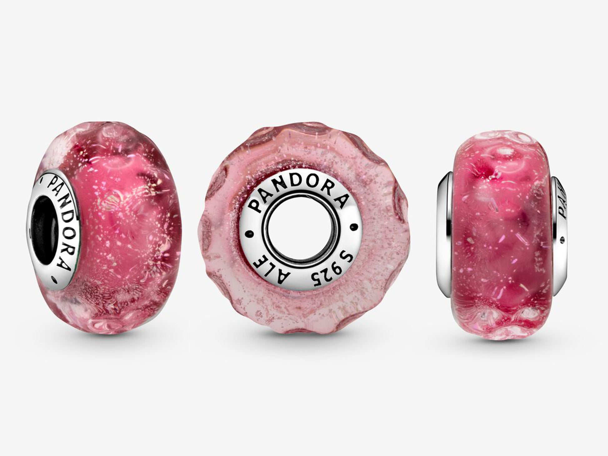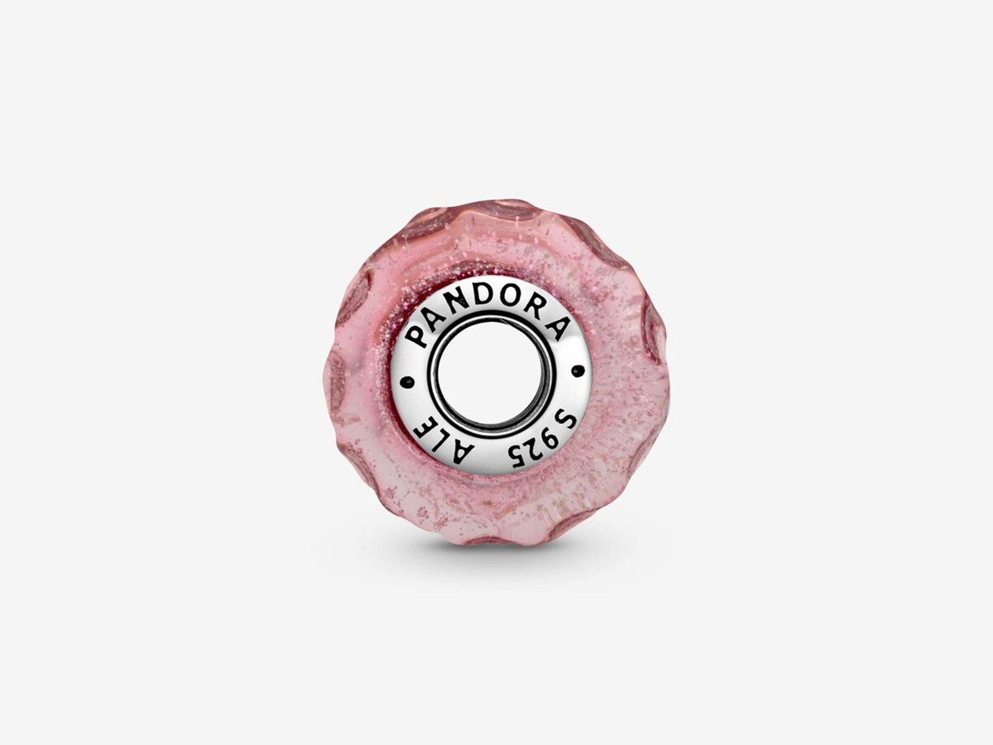 Colorful and sophisticated, the Wavy Fancy Pink Murano Glass Charm can elevate any outfit. Transform your look from ordinary to extraordinary with this Fancy Pink colored Murano glass charm filled with glitter and topped with a wavy glass surface. A touch smaller than our traditional Murano charms, this charm is the perfect complement to your style. Every Murano glass charm is hand finished and features a sterling silver core engraved with the Pandora logo.