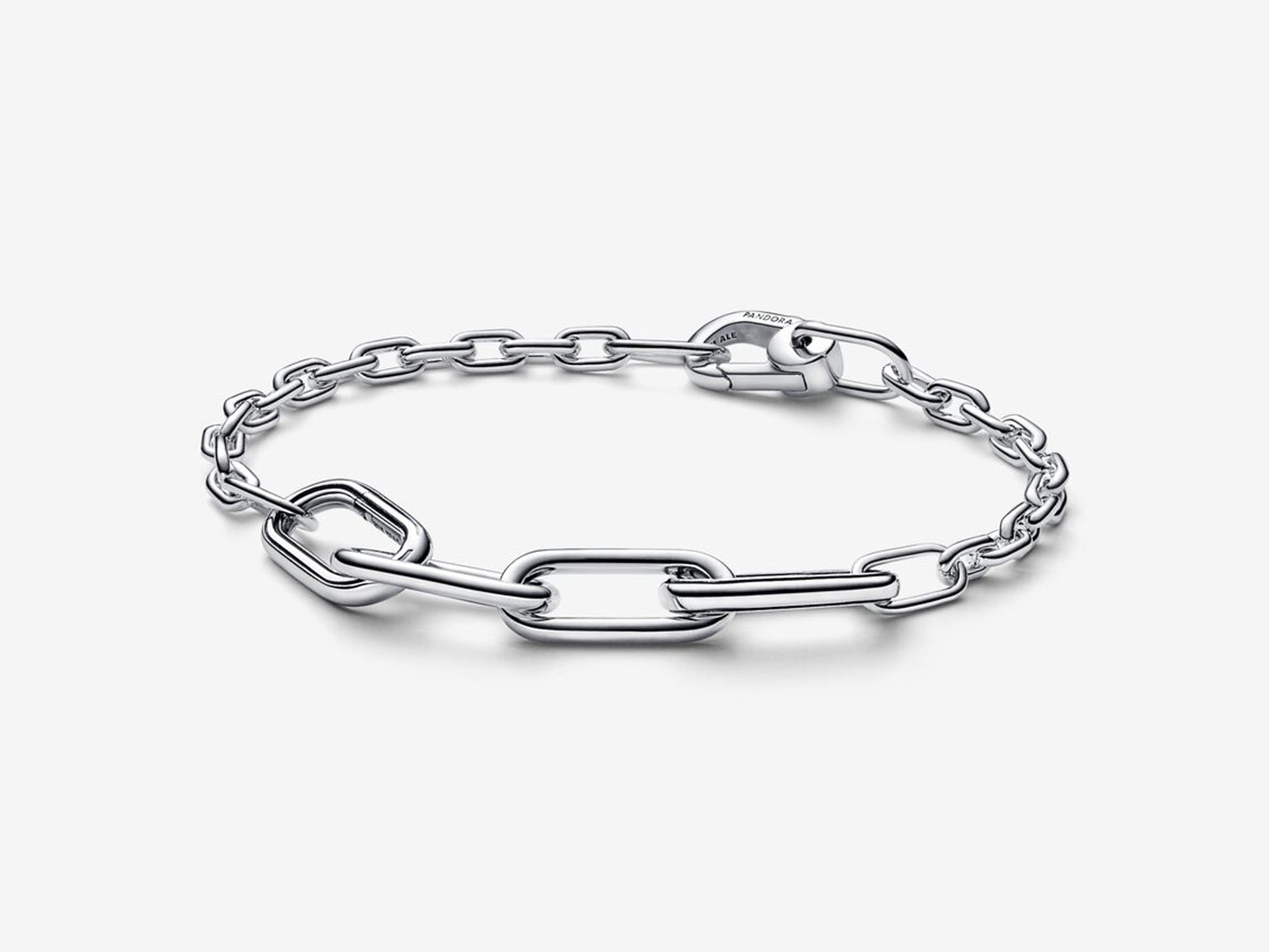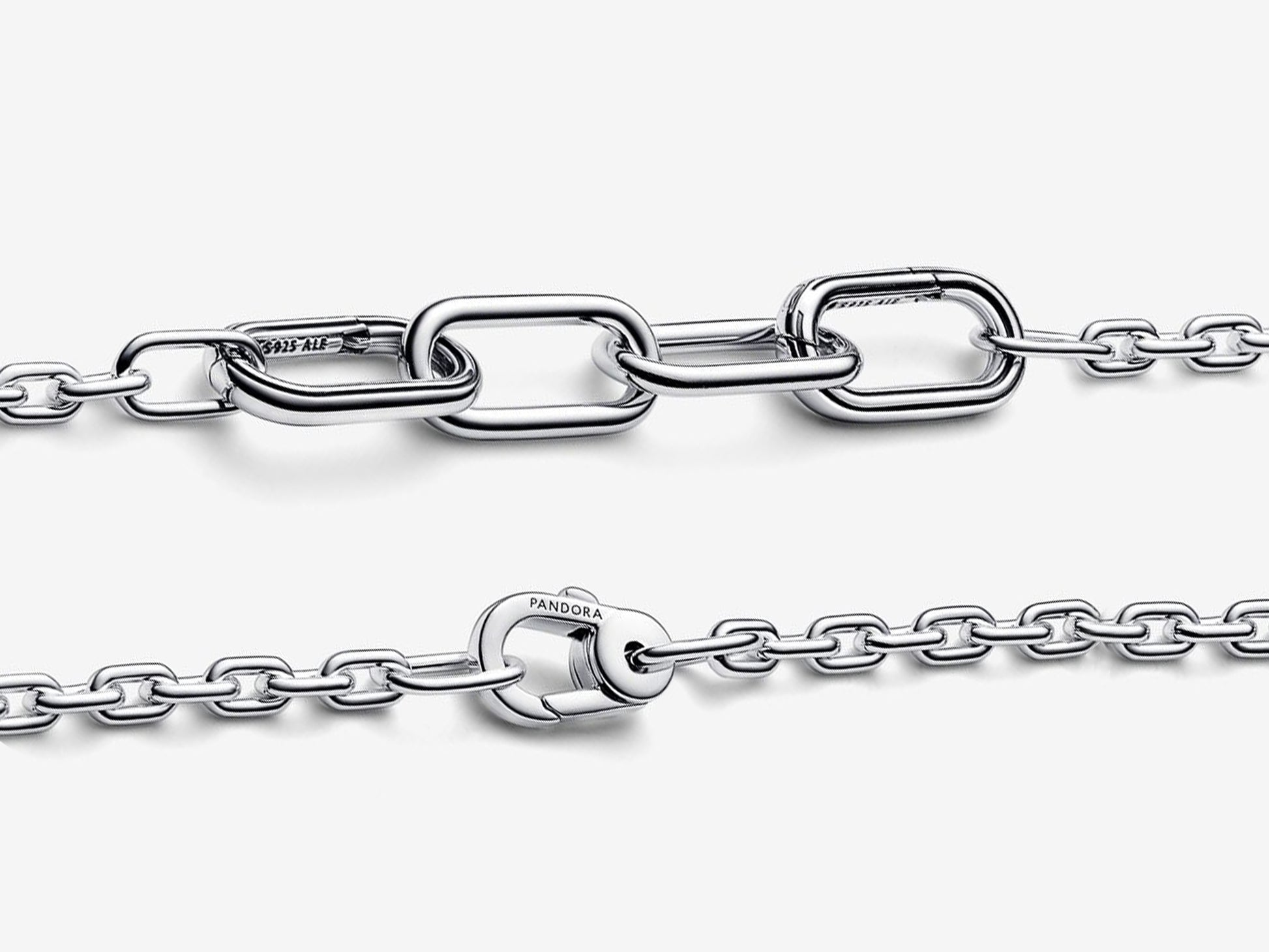 Link what you love like never before. Our sterling silver Pandora ME XS-Link Chain Bracelet holds endless styling possibilities, with more dimensions of links than ever before. The design features two larger openable links separated by a double openable link, a line of slimmer link chains and a carabiner clasp closure. First customise your link chain: four links can be swapped out for one openable double link or one openable link - keep the original length or adjust it to suit you. Once you’ve curated your link chain, style up to two meaningful medallion charms or up to eight mini dangle charms on each openable link to show the world who you are. NOTE: medallion charms with openable tops can be styled on closed styling links.