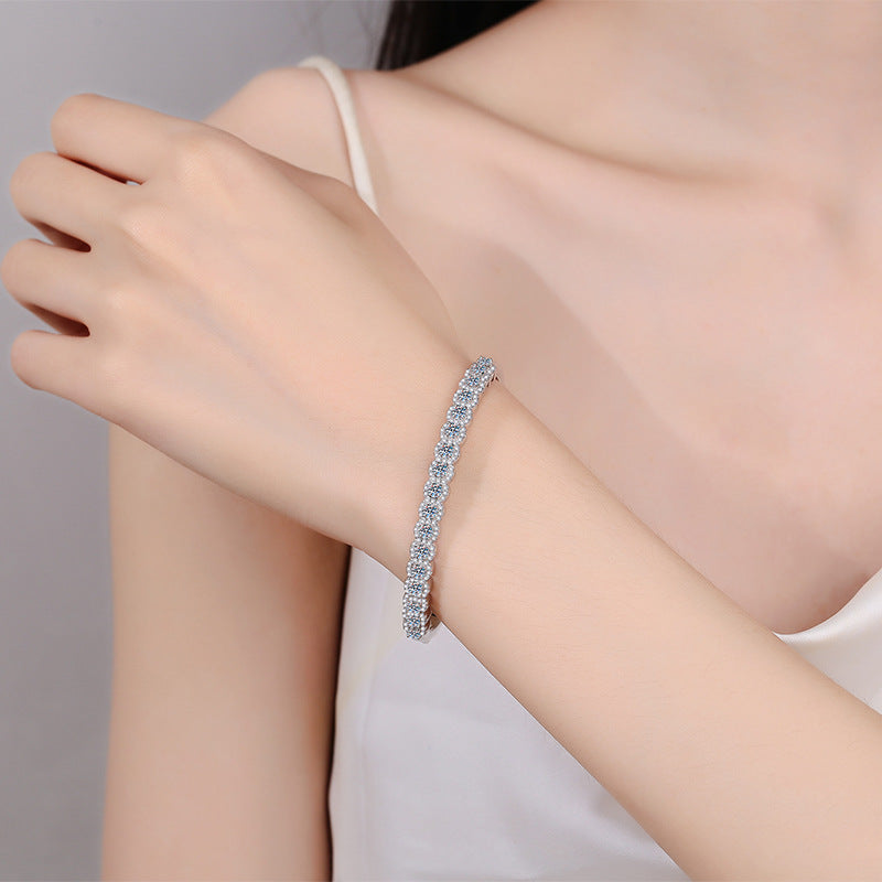 Embrace understated elegance with our minimalist floral bangle, featuring an impressive 3.03-carat Moissanite centerpiece set in a sophisticated 46x56mm oval frame. This exquisite piece combines graceful tulips, classic camellias, and lucky red beans with geometric diamond and star accents, all crafted from premium 925 Sterling Silver and finished with our signature 5-layer rhodium plating.